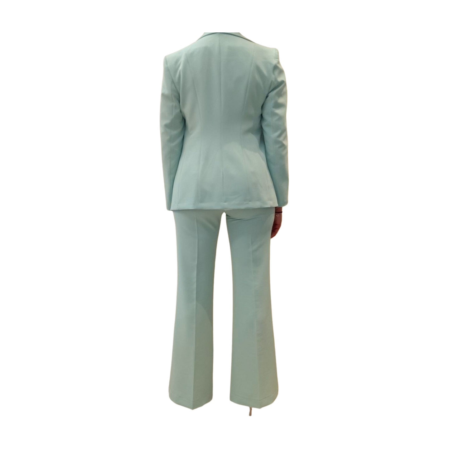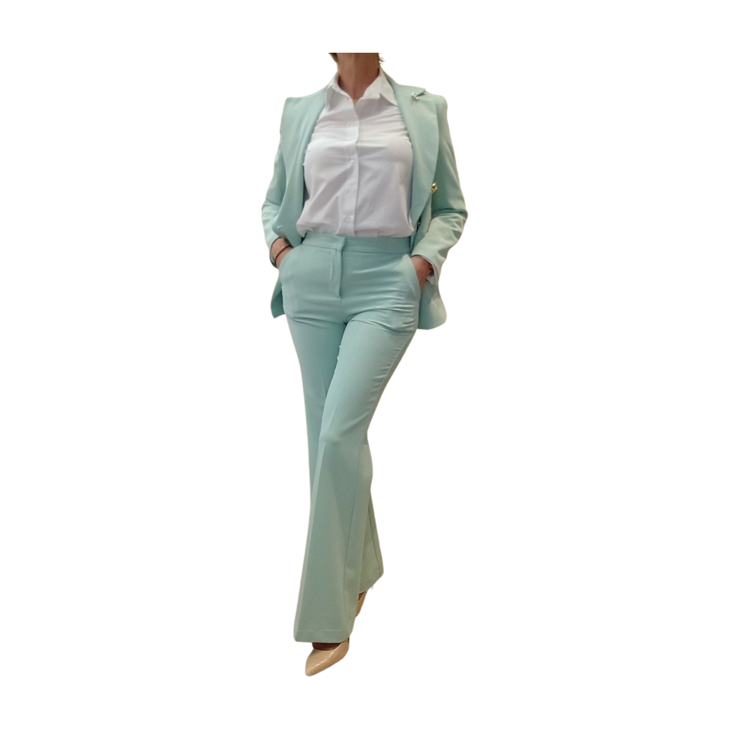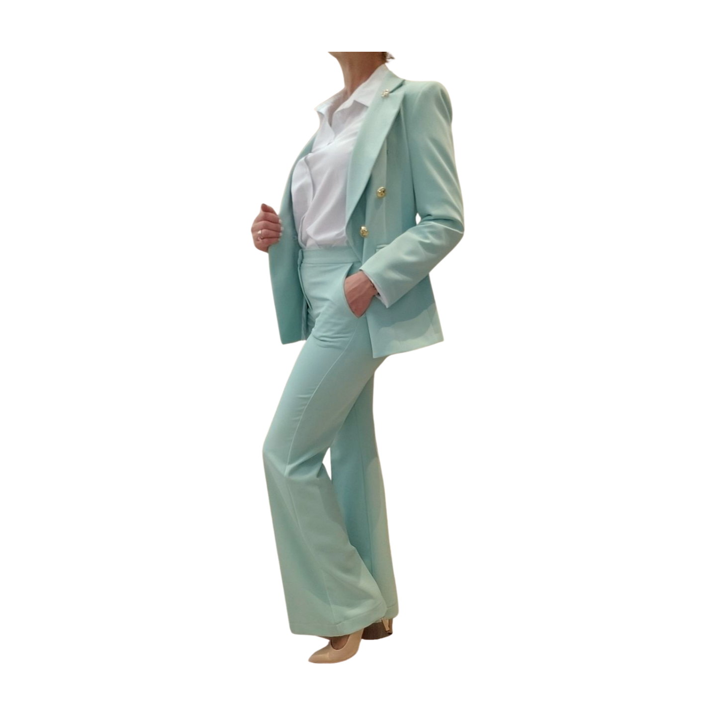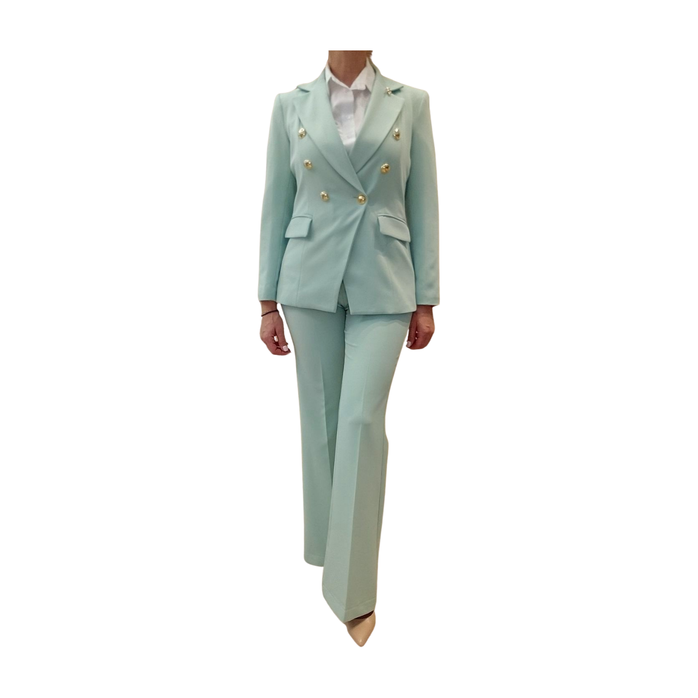 Koστούμι σε φυστικί χρώμα. Αποτελείτα από μεσάτο σακάκι με γιακά και πέτο και από παντελόνι καμπάνα εφαρμοστό. Το σακάκι εσωτερικά είναι φοδραρισμένο, διαθέτει βάτες στους ώμους και κλείνει με κουμπί. Στο μπροστινό μέρος έχει διακοσμητικά χρυσά κουμπιά και από τις δύο πλευρές, όπως και μία διακοσμητική χρυσή καρφίτσα αρκουδάκι. Διαθέτει δύο πλαϊνές τσέπες. Το παντελόνι κλείνει με φερμουάρ, κόπιτσα και κουμπί. Διαθέτει δύο πλαϊνές τσέπες και μία διακοσμητική στο πίσω μέρος του παντελονιού. Η γραμμή του κολακεύει όλους τους σωματότυπους. Αν το συνδυάσεις και με τα ψιλοτάκουνά σου, σου προσδίδει ακόμα περισσότερο ύψος και βελτιώνει τις γραμμές σου.